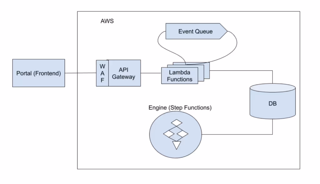 Quanto a “engine”, escolhemos o Step Functions devido à sua facilidade de configurar um sistema de fluxo com etapas, verificações e re-tentativas. Usamos Python porque a maioria das ferramentas de segurança e os SDKs para as APIs com as quais interagimos são escritos em Python. E por essa razão, a maioria dos especialistas em segurança, incluindo aqueles que atualmente trabalham na Tenchi, são bem versados em Python. Portanto, a escolha da linguagem foi boa. No entanto, isso cria uma situação em que compartilhar código entre a API e a “engine” é complicado. Para mitigar isso, temos uma API interna que torna o acoplamento entre a API e a “engine” independente.