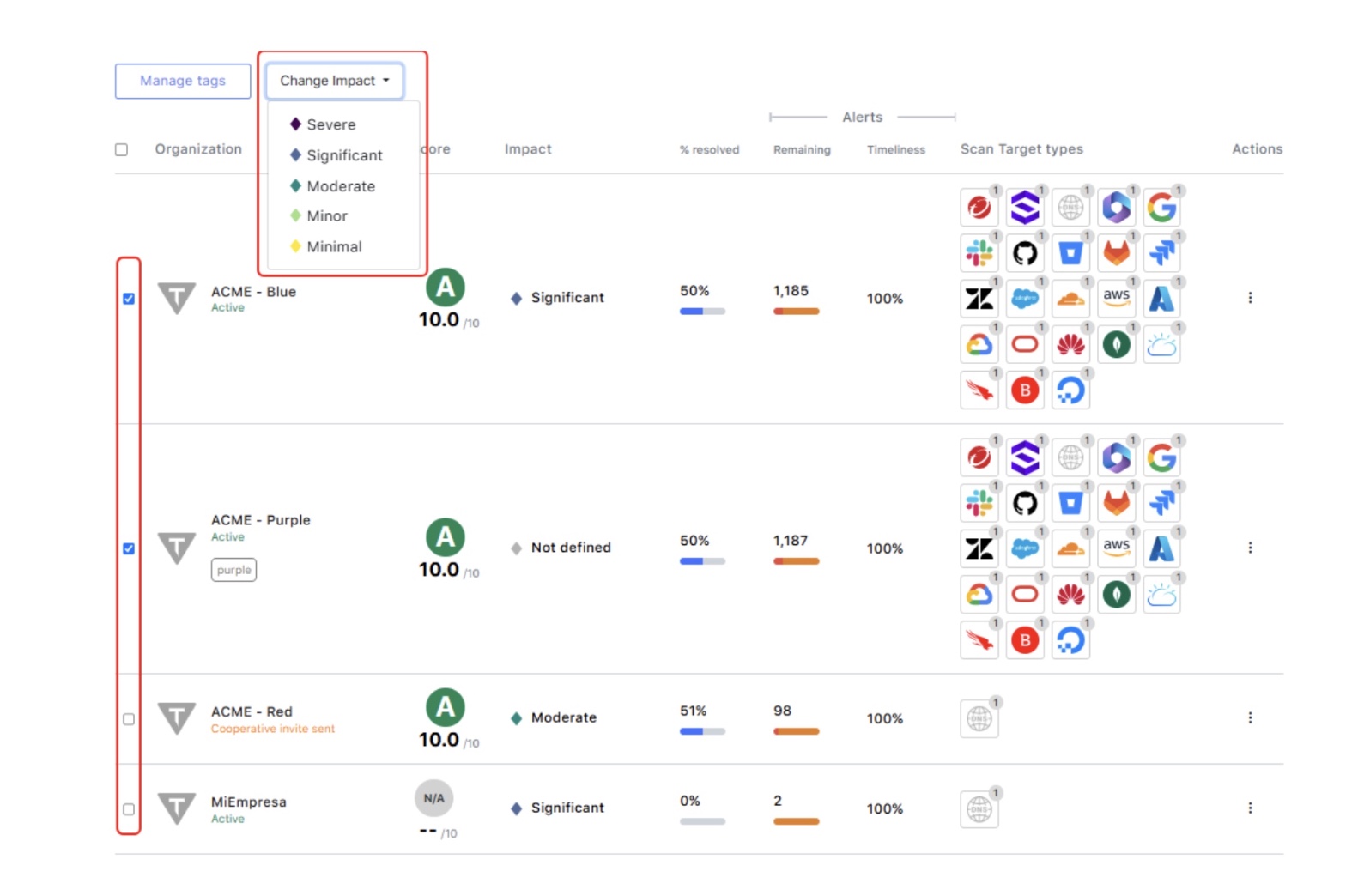 Check each following organization and choose the desired Business Impact level to set from the dropdown menu above it.