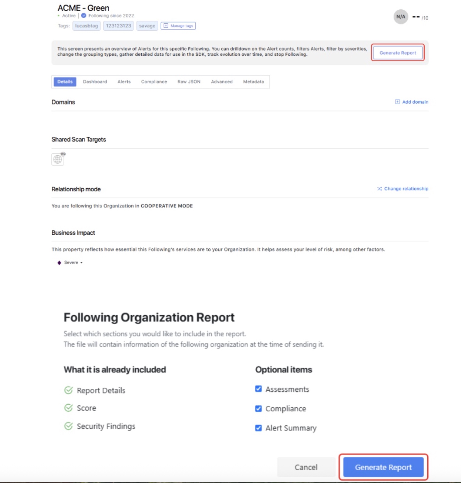 On the Scan Target details page, the Following Organization will be able to see the Tab “Tags and Sharing”, in order to view or edit the sharing type and the list of Follower Organizations that will have visibility on the corresponding Scan Target.