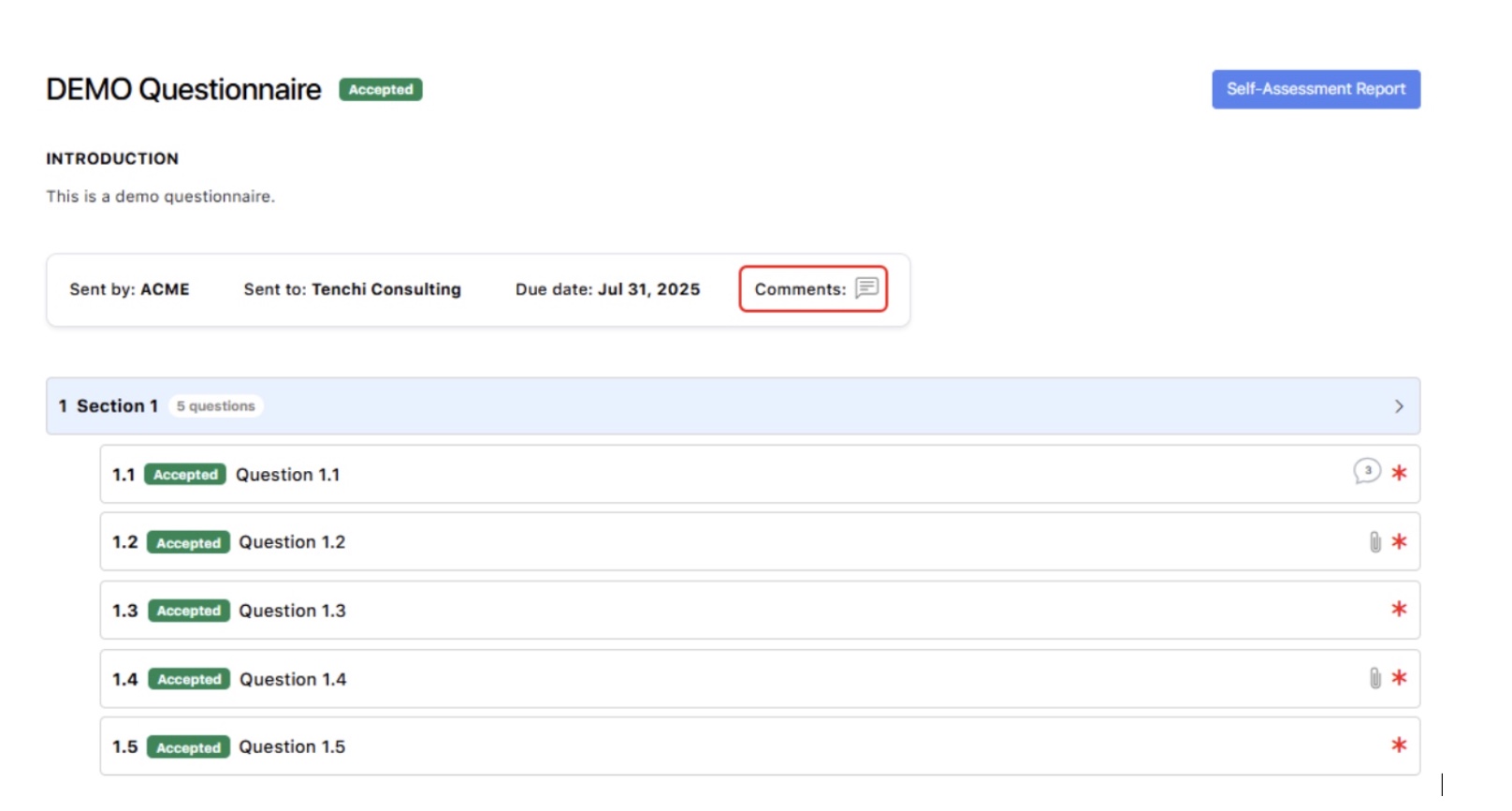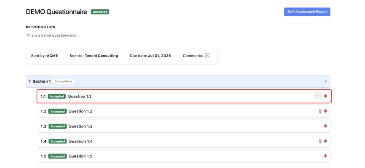 This feature allows users to view the complete historical information for an assessment, including detailed information for each question (such as the answers and comments provided), any associated comments for the questionnaire, the users that provided information, and the history of status changes. It aims to enhance transparency and traceability within assessments and the interaction between organizations (1st party and 3rd parties).